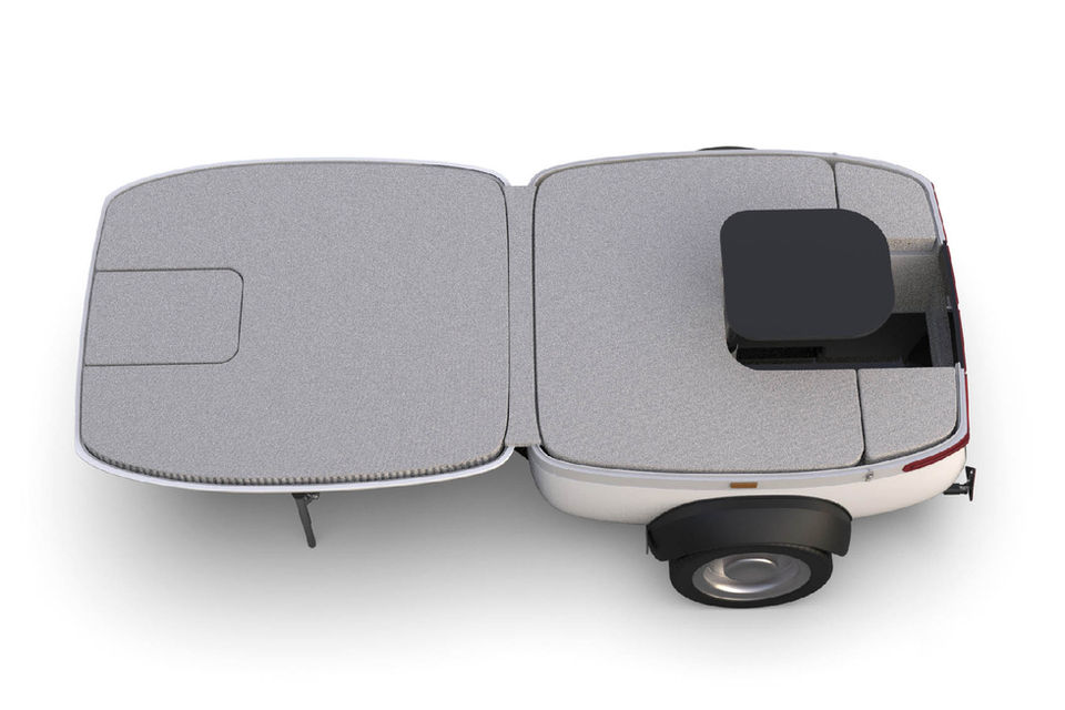 Trailer without brakes Seats: 2 + 2 Sleeping/lying area with spring elements Swivelling, removable table 5 storage compartments 1 thermally insulated storage compartment Ripstop outer tent min. 5,000 mm water column Tent chambers with electric pump 2 side windows & 1 roof window 11 ventilation areas Inner tent for darkening with 2 plug-in pockets 2 crank supports for levelling the floor 2 swivel supports for levelling the lying surface Fibre composite body 2 Ecoflow River 3 with: 245 Wh capacity, 300 W rated power AC output × 1 DC output × 1 USB-C output × 1 USB-A output × 2 DC output switch AC output switch 12V LED lighting inside (warm white) 3 illuminated compartments with motion sensor Water tank: 45 litres can be filled from the outside Diaphragm pump 17 l/min Outdoor shower with 180 cm length Alloy rims Colours RAL 7034 YellowGrey RAL 9004 Signal Black RAL 9023 Perl Dark Grey RAL 3020 Traffic Red Two Colors for lid Choice of 3 colours for wrapping 15.900.- € incl. 19% VAT plus shipping